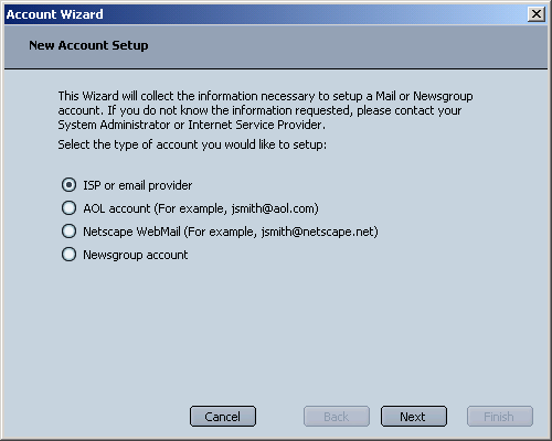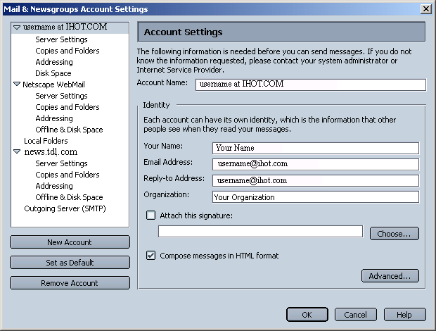That brings up the Mail & Newsgroups Account Settings window Here you can change your name, and email address, but not the server that you check. To set up Netscape to Check your Internet Hotline mail, click on New Account