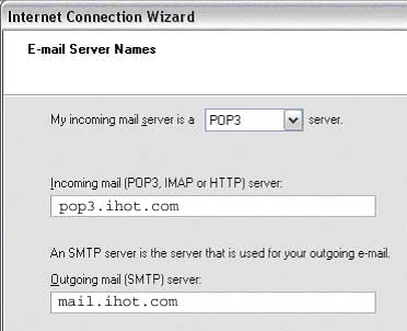 The above setting above and in the picture below are for IHOT.COM e-mail accounts only. If you are using web hosting then the setting will be different. See your Web Site Administrator for the correct settings.