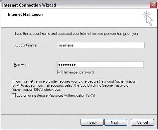 Enter the following: Account name:your E-Mail Account/POP Username from your Account Information